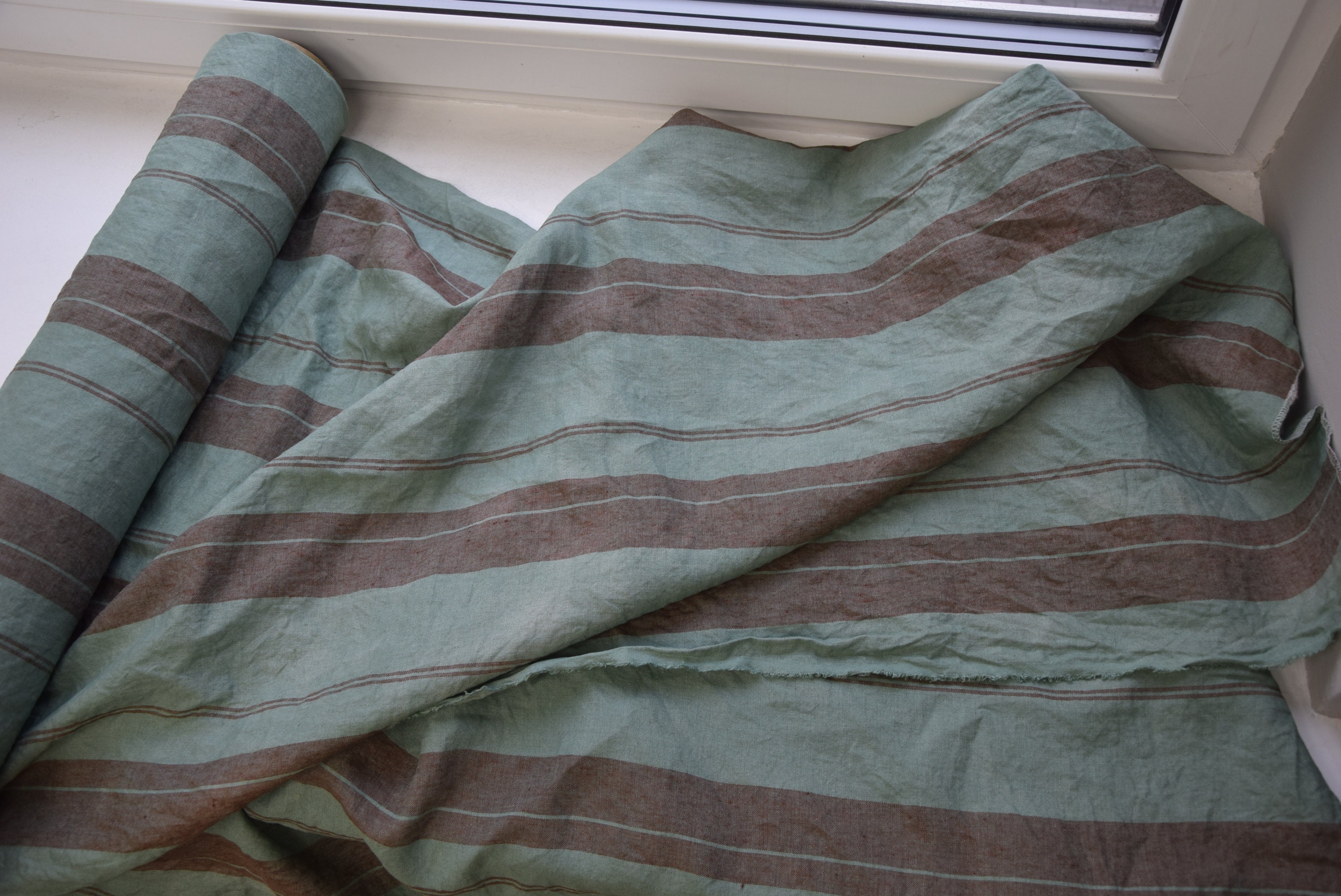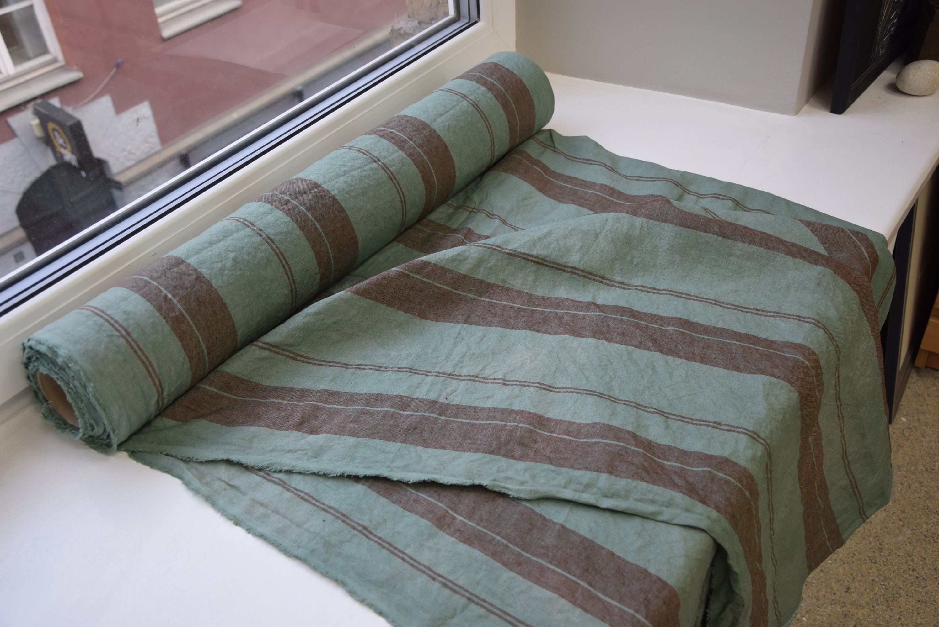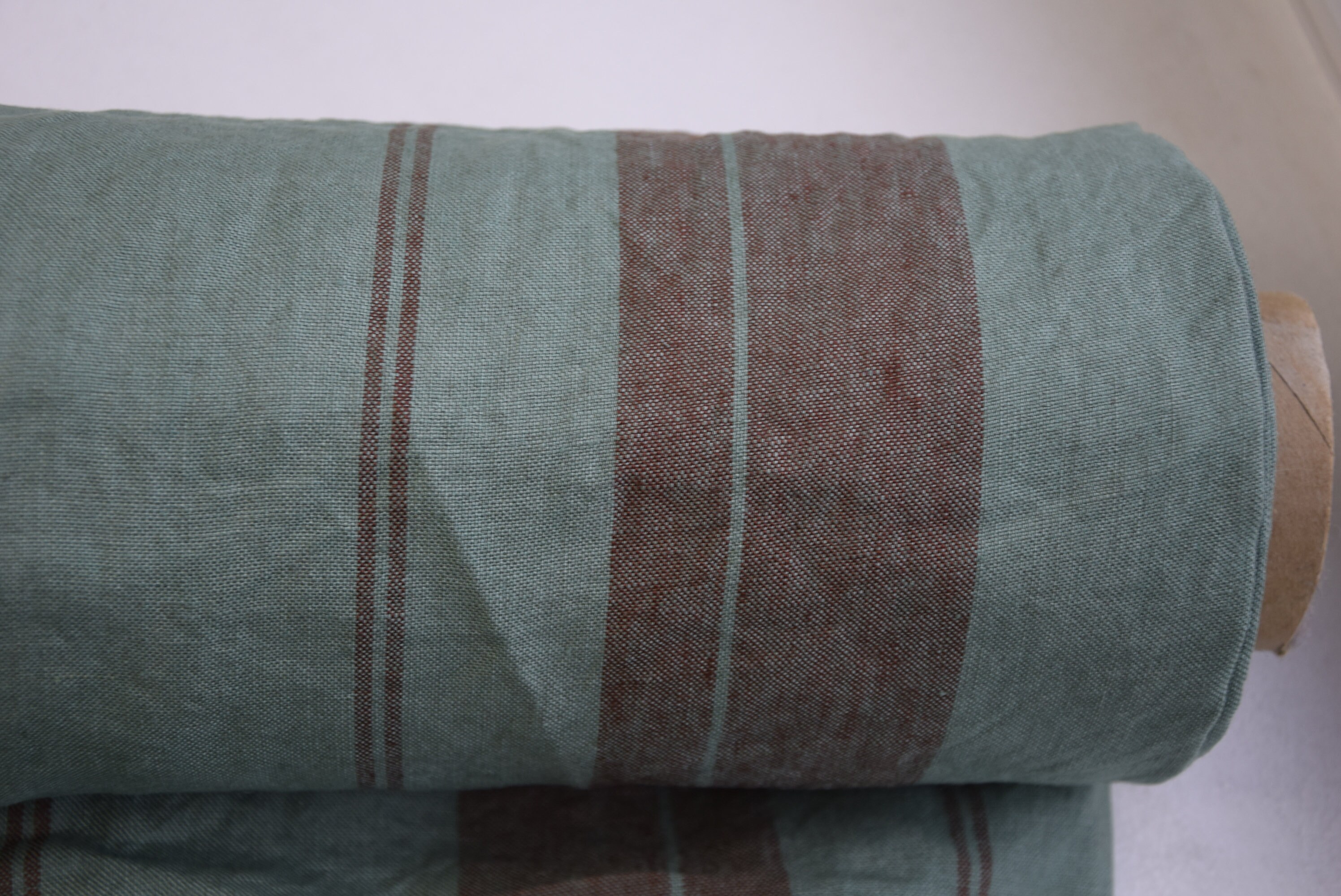 Pure linen fabric Elba Green with Marron Stripe. Middle weight, dense, not sheer, stripped. Aesthetic, strong and durable. Natural, organic, eco-friendly and antistatic. Relaxing, tranquil, breathing and pleasant to touch. Medium weight and medium thickness, densely and plainly woven. Softened, washed and pre-shrunk. Machine washable or dry cleanable. High quality. Suitable for clothes and for other textile (bedding, table linens, cushions, curtains, etc.). Green background, striped with muted redish-brown color. The stripes go along the side and pattern repeats at each 19cm (7 2/4"). The price per 1 meter (1.094 yard) of this fabric is 23.34 EUR.
