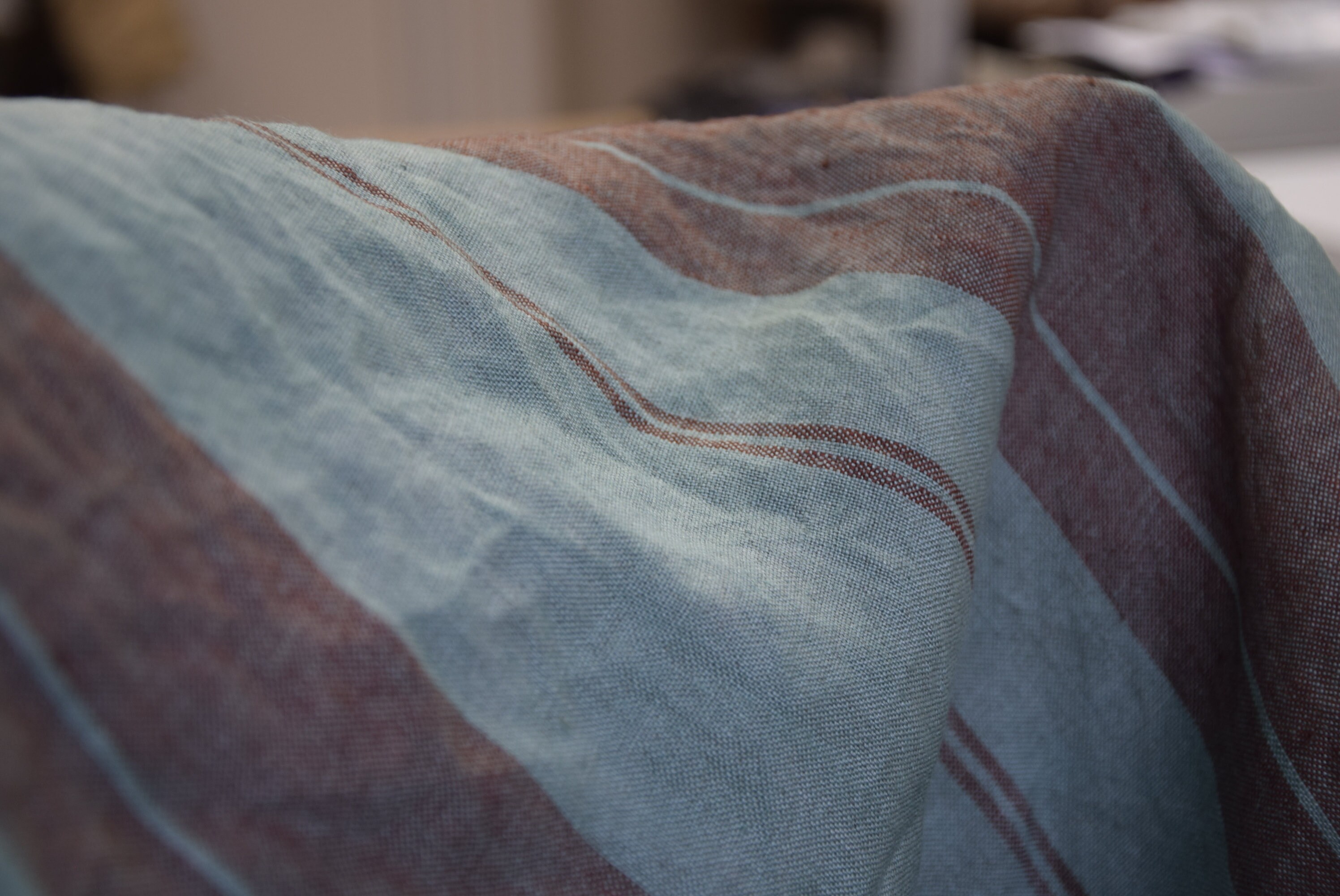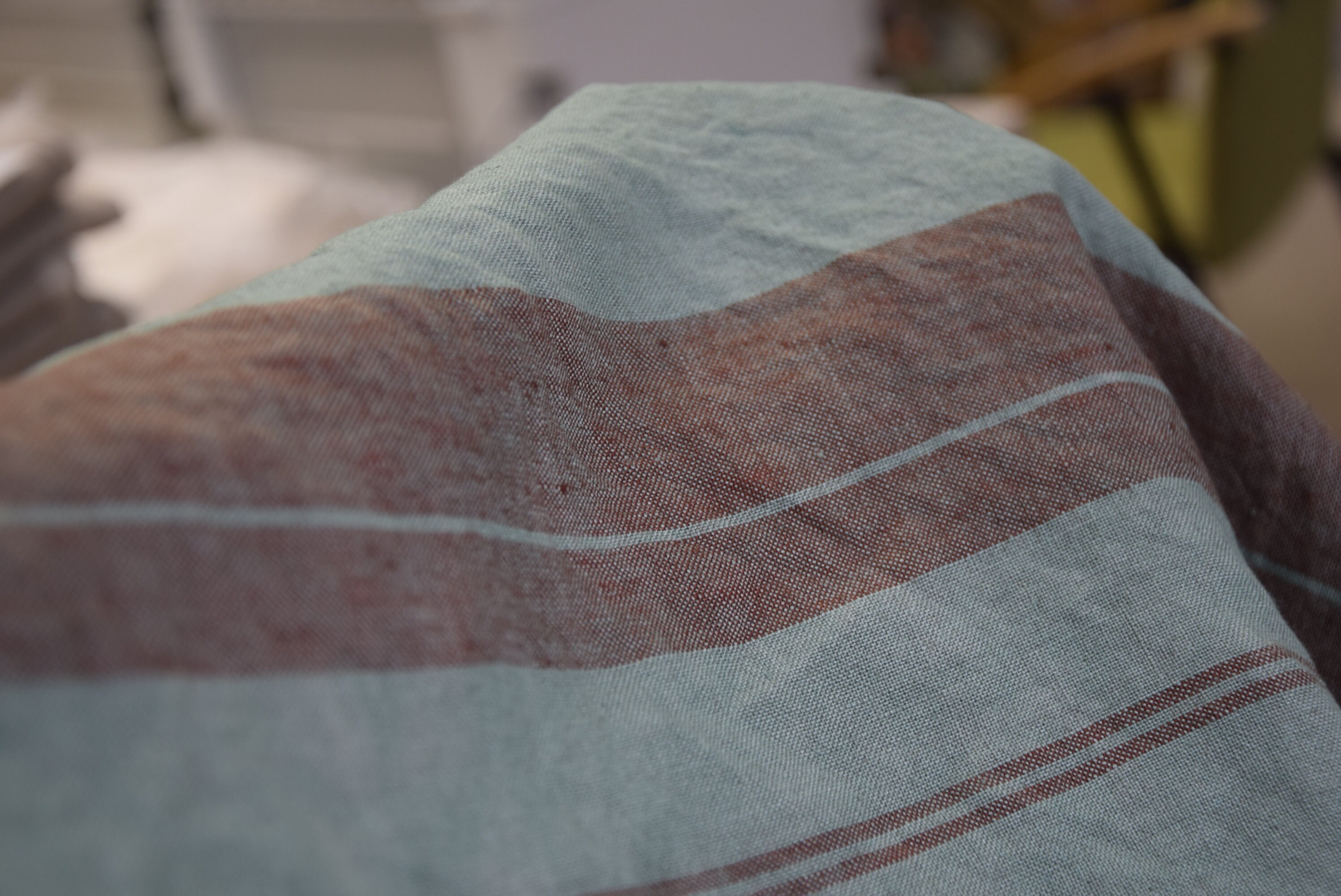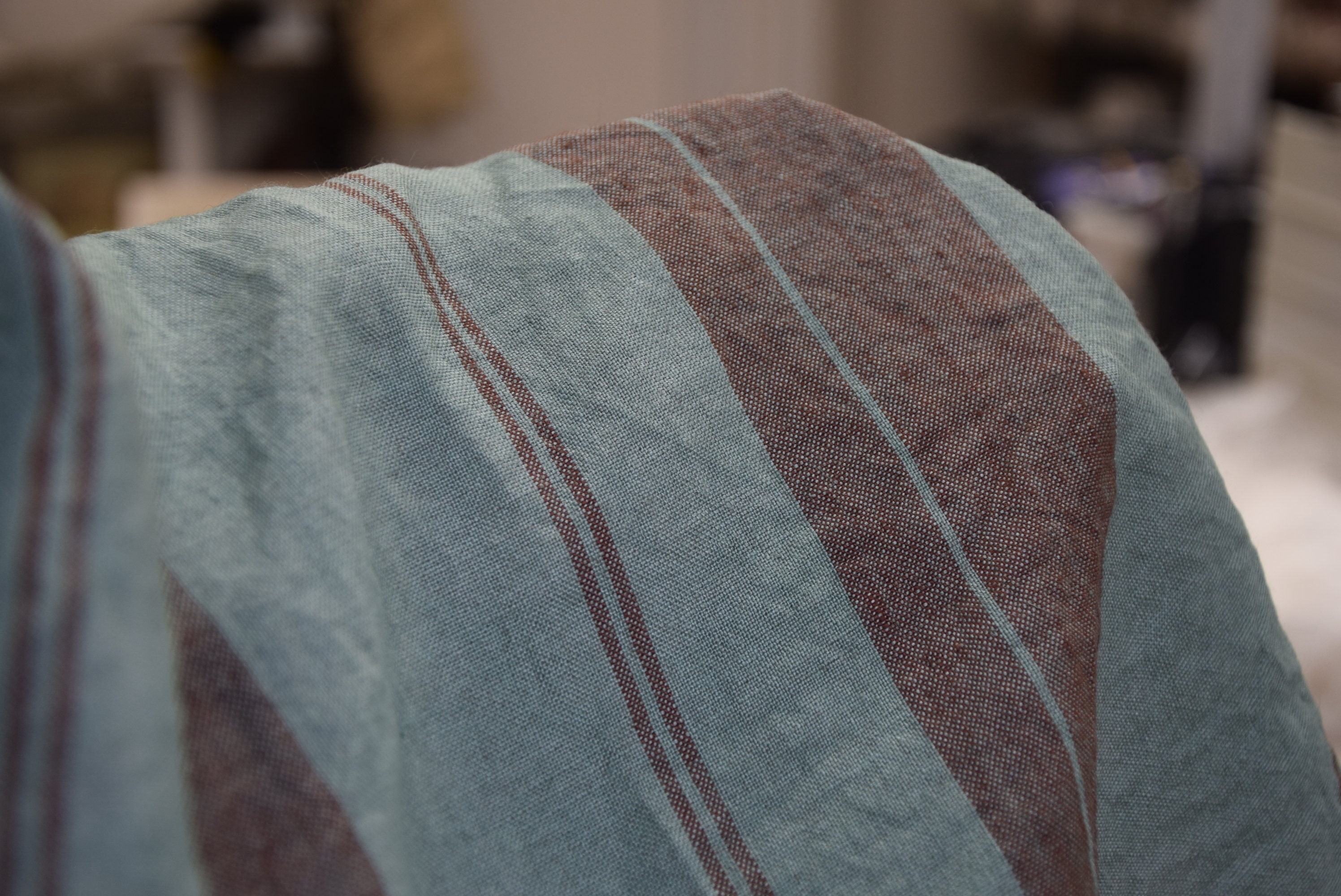 Pure linen fabric Elba Green with Marron Stripe. Middle weight, dense, not sheer, stripped. Aesthetic, strong and durable. Natural, organic, eco-friendly and antistatic. Relaxing, tranquil, breathing and pleasant to touch. Medium weight and medium thickness, densely and plainly woven. Softened, washed and pre-shrunk. Machine washable or dry cleanable. High quality. Suitable for clothes and for other textile (bedding, table linens, cushions, curtains, etc.). Green background, striped with muted redish-brown color. The stripes go along the side and pattern repeats at each 19cm (7 2/4"). The price per 1 meter (1.094 yard) of this fabric is 23.34 EUR.