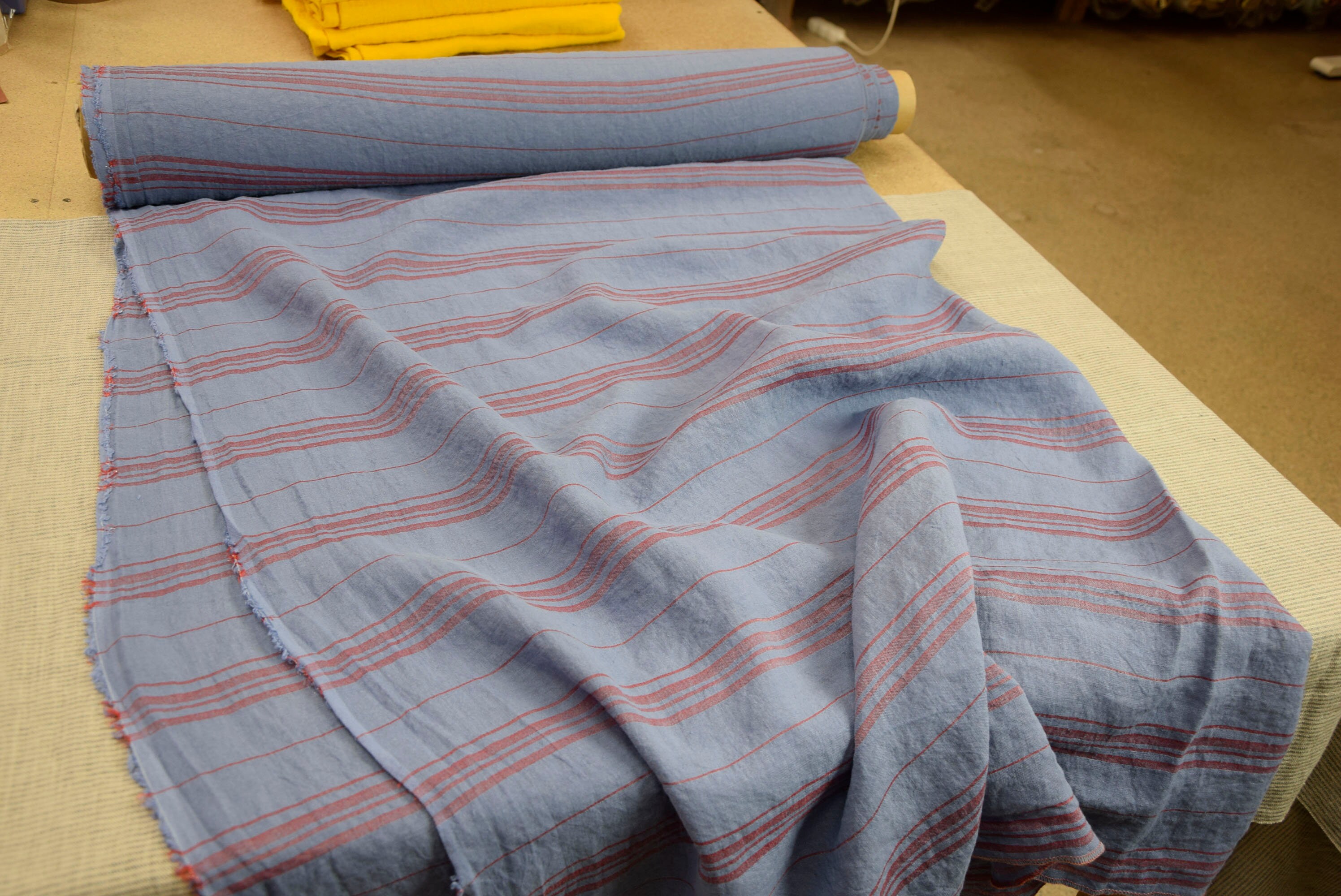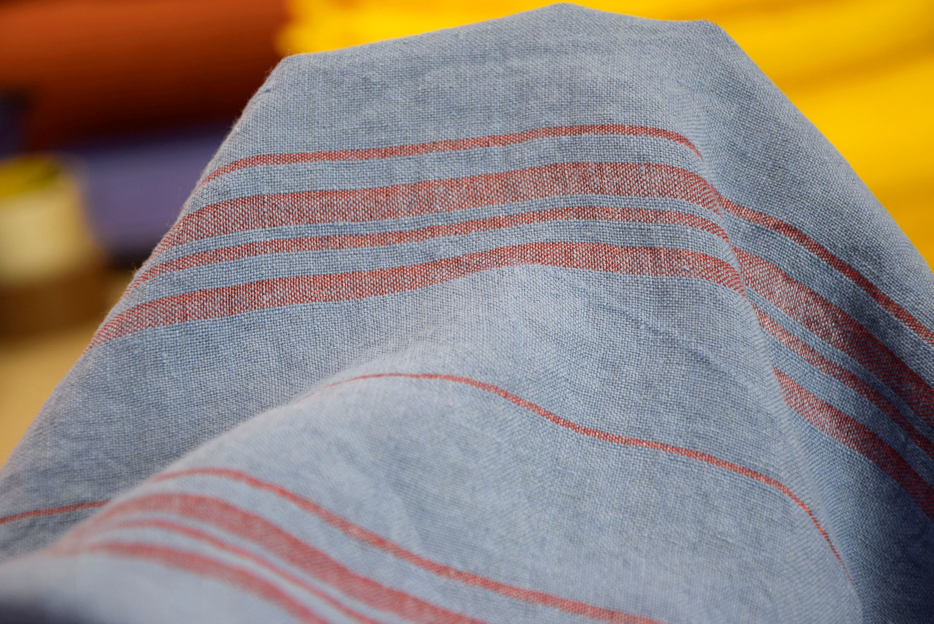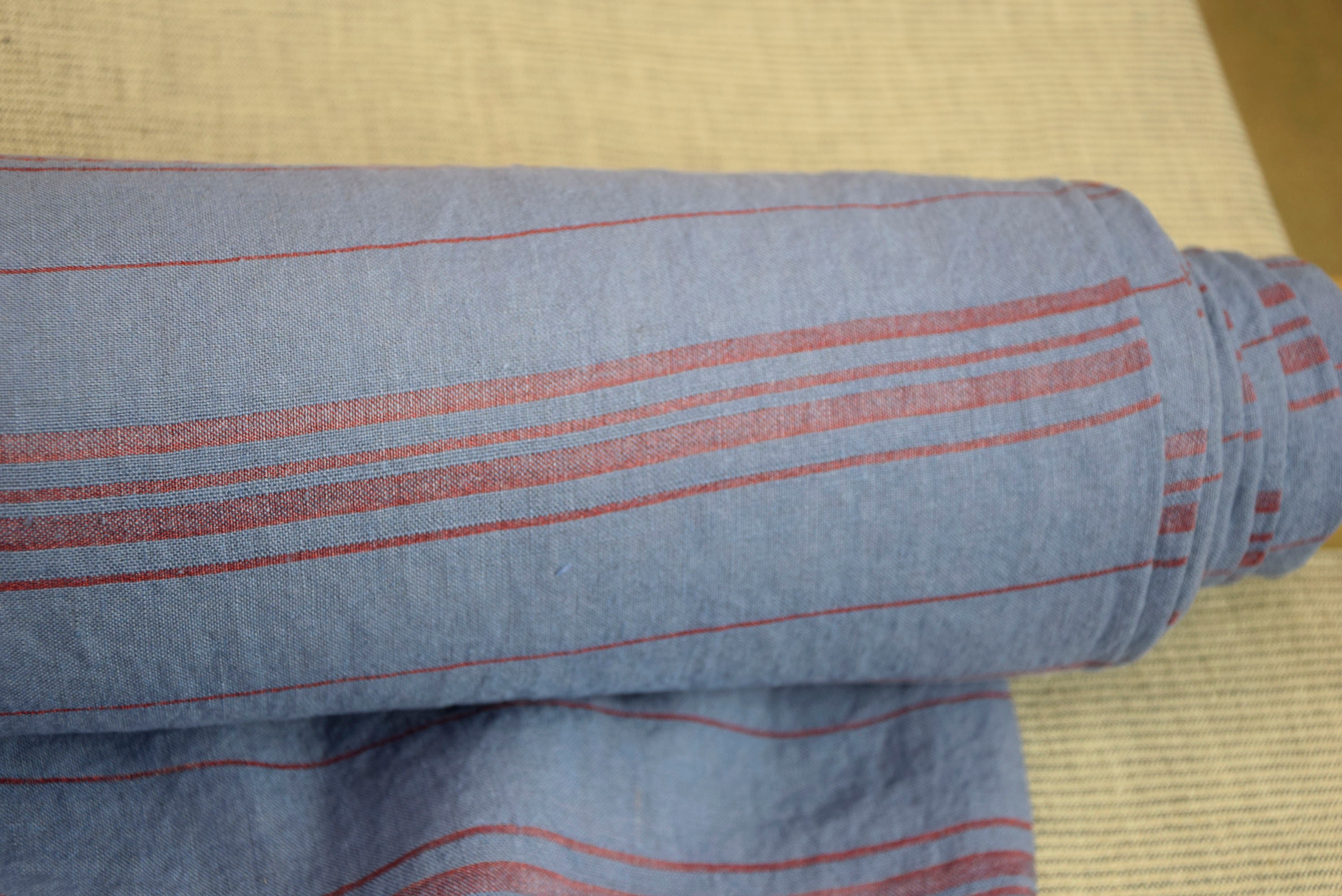 Pure linen fabric Stella Very Peri color with Red Lurex, middle weight. A periwinkle blue with violet-red undertone, red horizontal stripes at each 10cm. Densely woven, not sheer, soft. Drape characteristic are good. Suitable for clothes and for other sewings (bedding, cloth napkins, curtains, tablecloths, scarfs and many other textile). Linen fabric dyed in Pantone 17-3938 Very Peri color may vary from the Pantone Color Standards based on lighting conditions, angle of view and/or due to differences in pigments, manufacturing process, the initial color of raw linen flax. A regular price for 1 meter (1.1. yard) of this fabric is 26.83EUR.