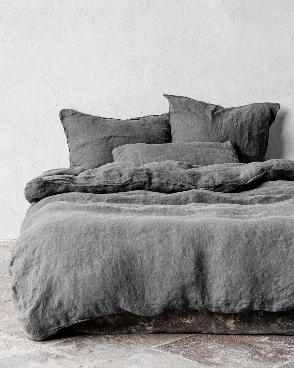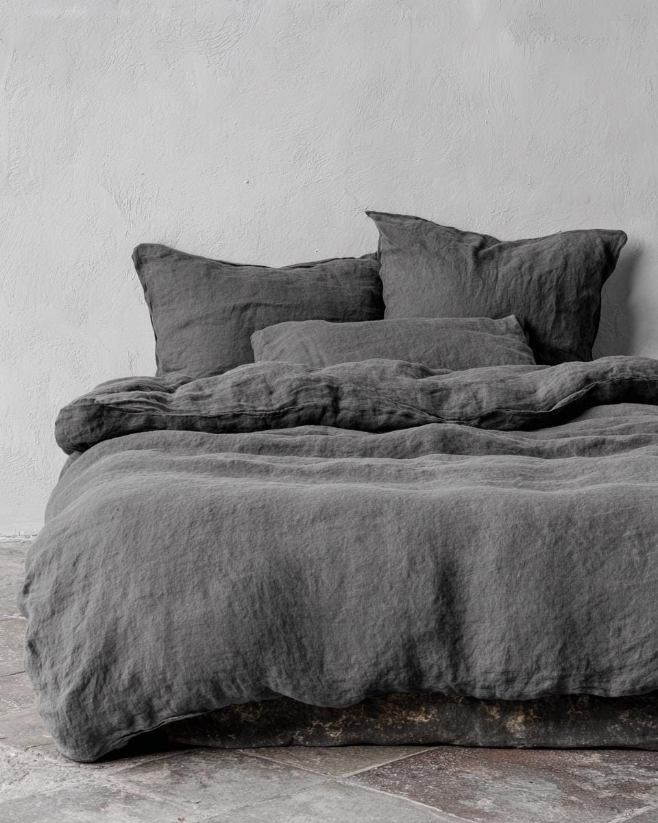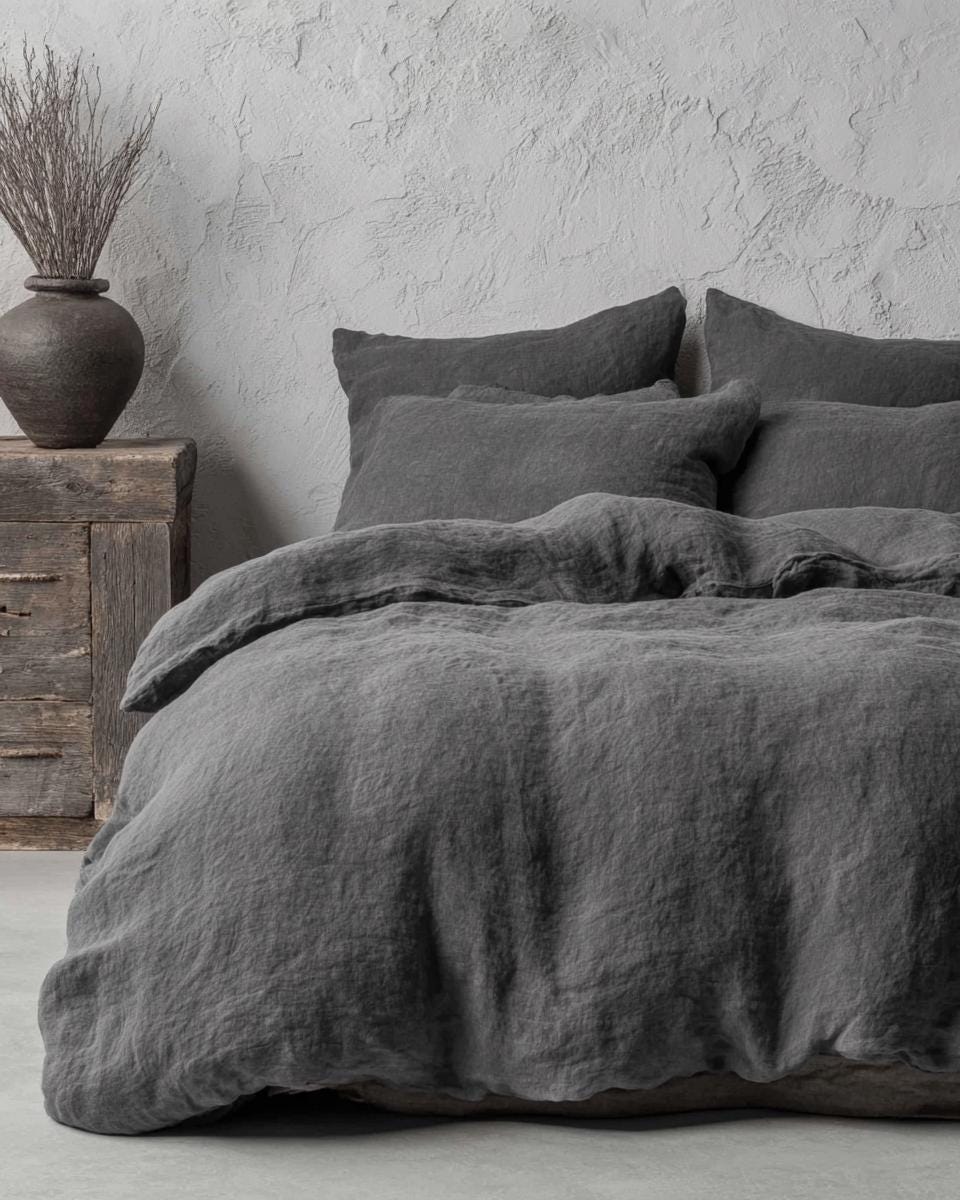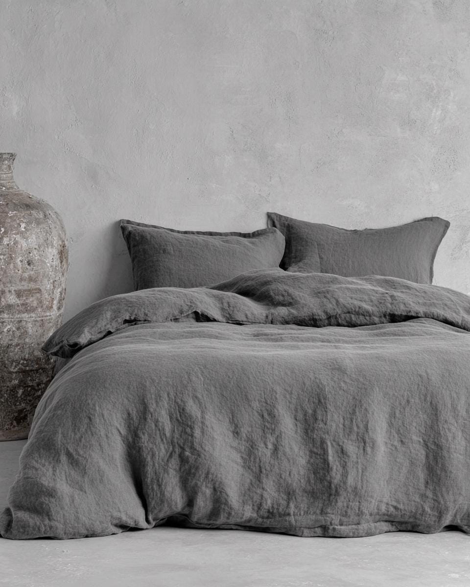 The IRONWOOD collection features a dark gray color, pre-washed for comfort and a relaxed, slightly rumpled look. Linen is temperature-regulating, making this duvet cover ideal for all seasons.