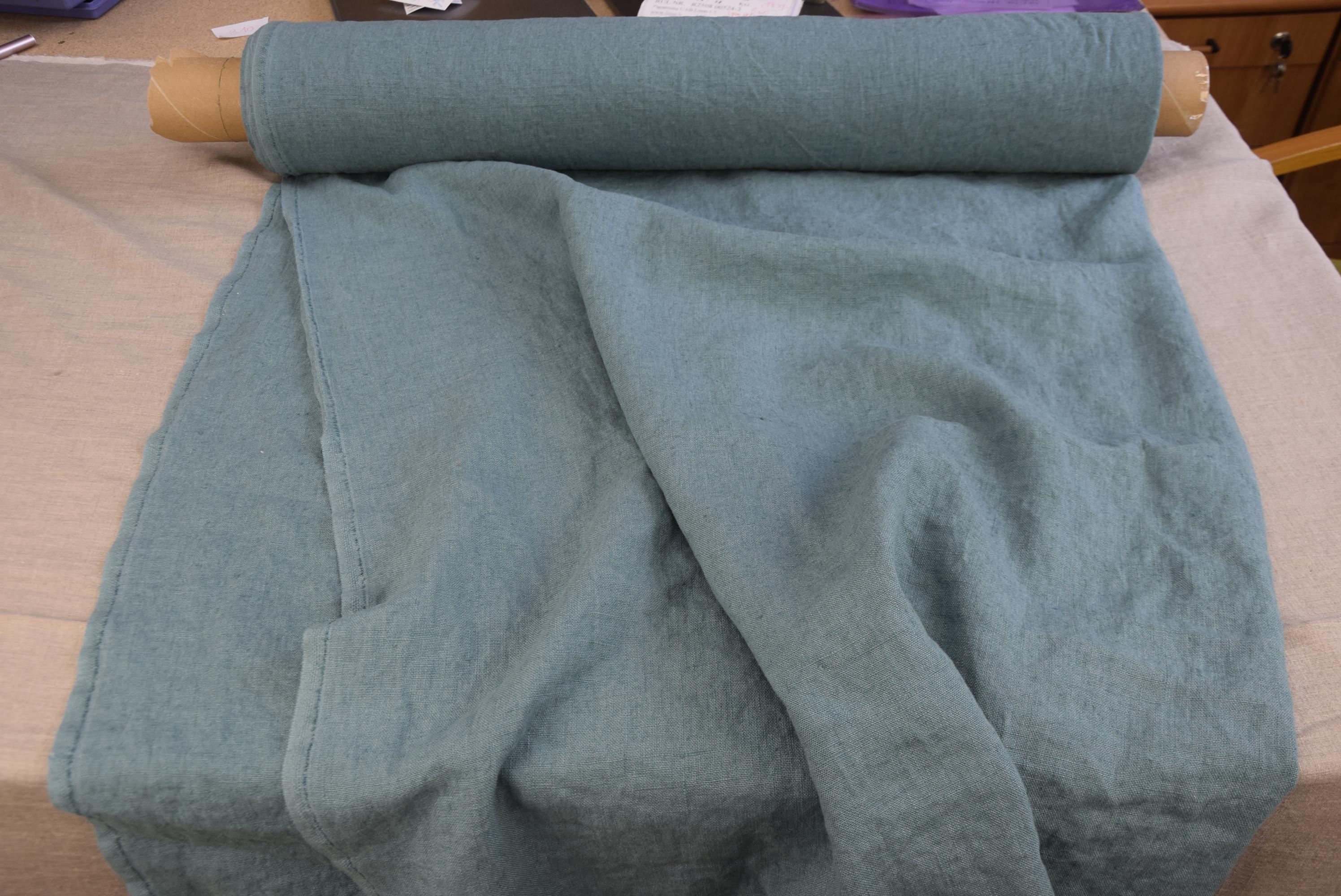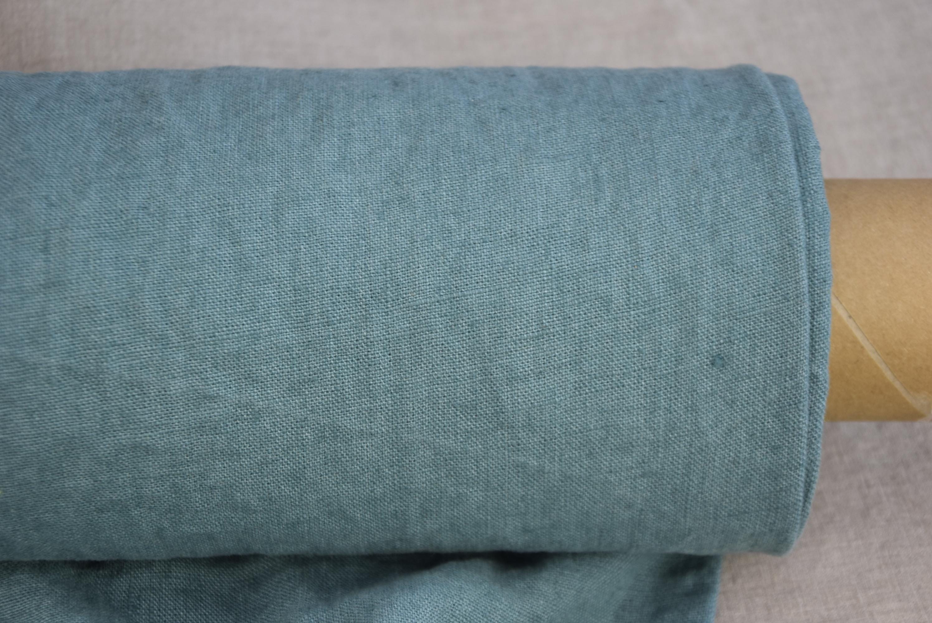 Blue Spruce is a muted blue-green with soft gray undertones. The shade is medium in depth and slightly desaturated, giving it a dusty, natural, and earthy character. It sits between teal and sage, leaning a bit toward the blue side, similar to the tone of evergreen needles or coastal sea glass. The natural linen weave softens the color further, creating a washed, organic look that feels calm, sophisticated, and nature-inspired.