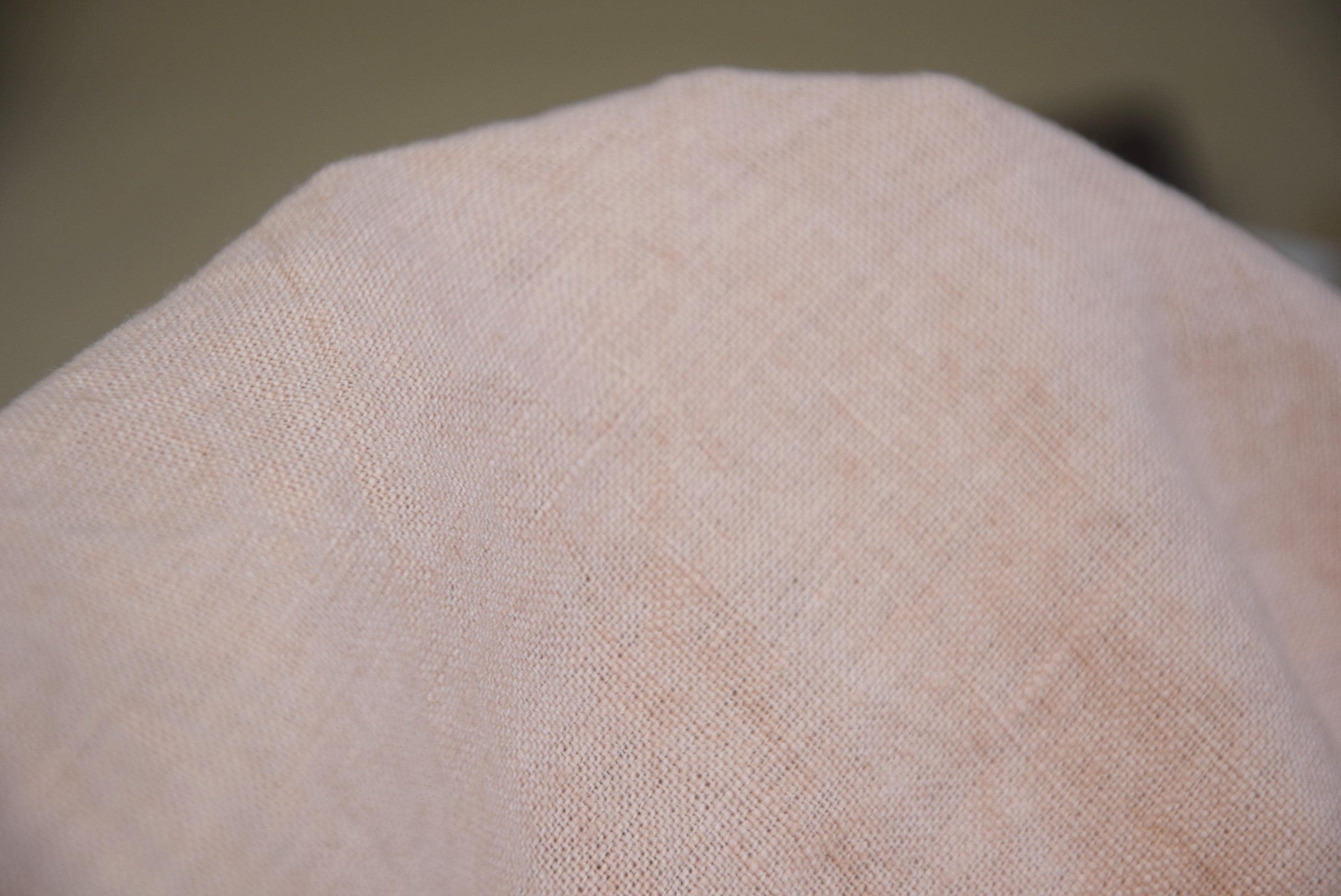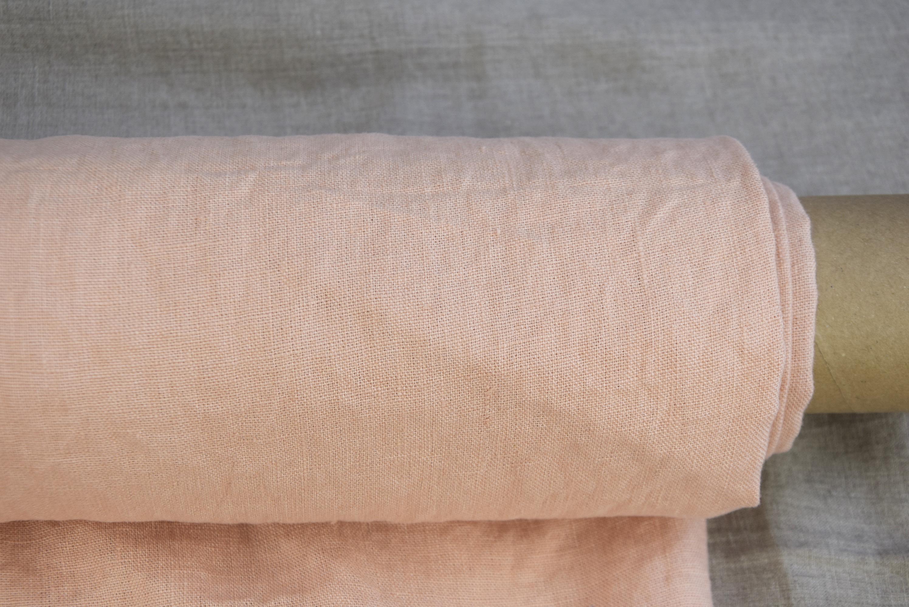 Pastel Peach Blush is a soft, delicate blend of warm peach and gentle blush pink. The shade appears light, airy, and slightly creamy, with a subtle warmth that prevents it from feeling overly sweet or bright. Linen’s natural texture gives the color a powdery, washed effect, making it look calm, elegant, and organic. The tone resembles peach blossom petals, diluted coral, or early sunrise light, creating a romantic and soothing appearance that works beautifully for clothing and home textiles.
