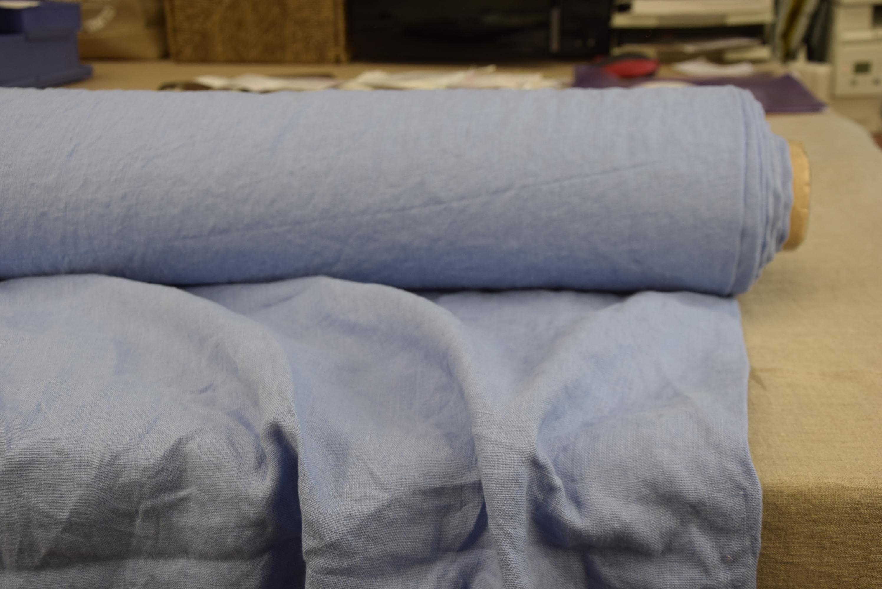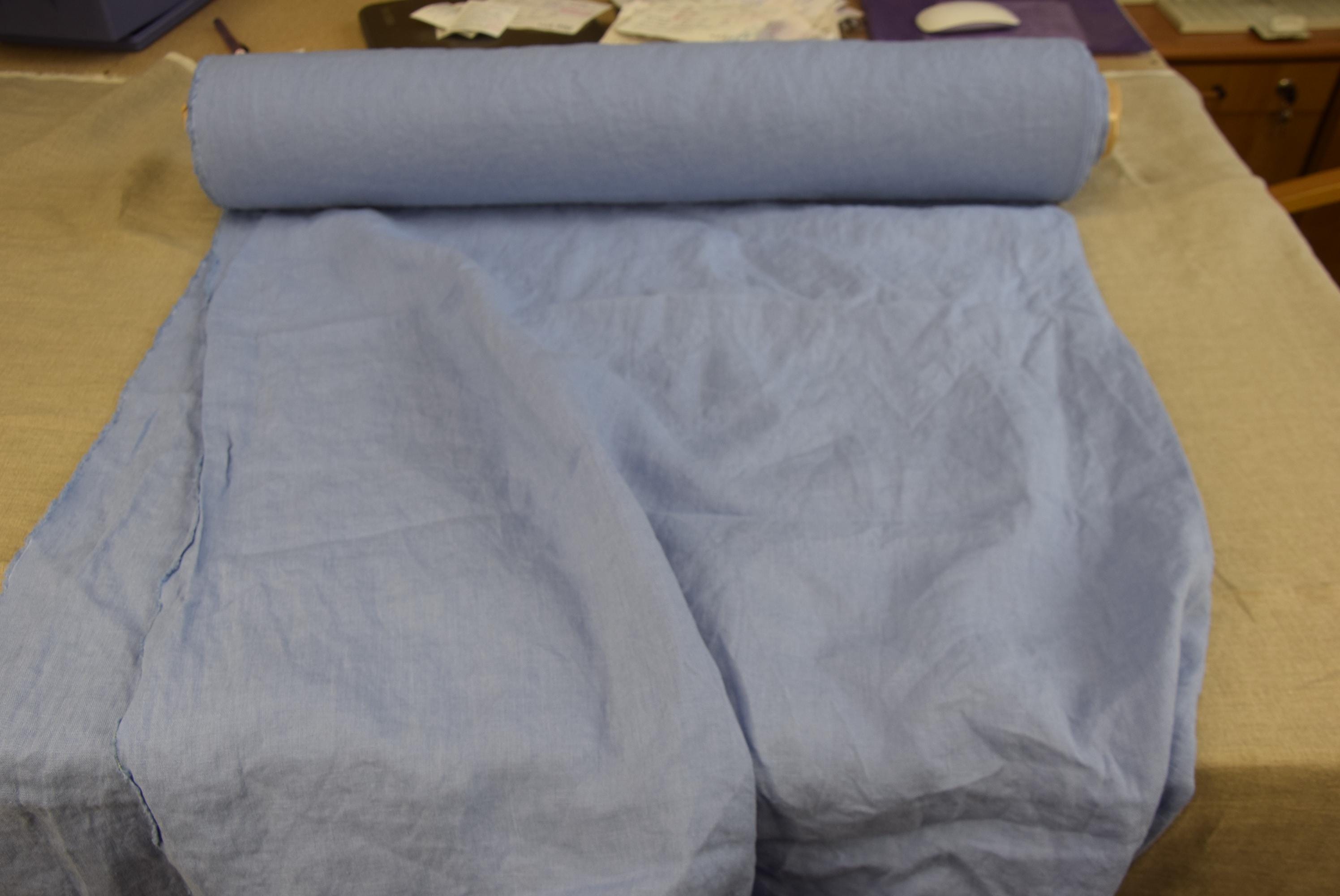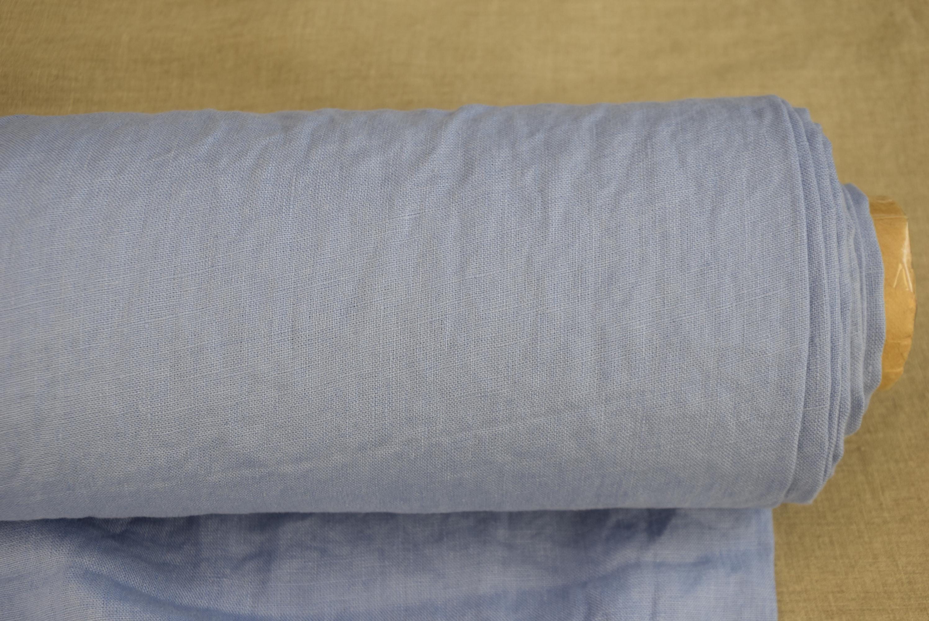 Dusty Powder Iris Blue a soft muted blue. The shade sits between powder blue and grayish periwinkle, giving it a calm, airy look. It has a washed, pastel quality that works well for natural linen textiles and feels gentle rather than bright.