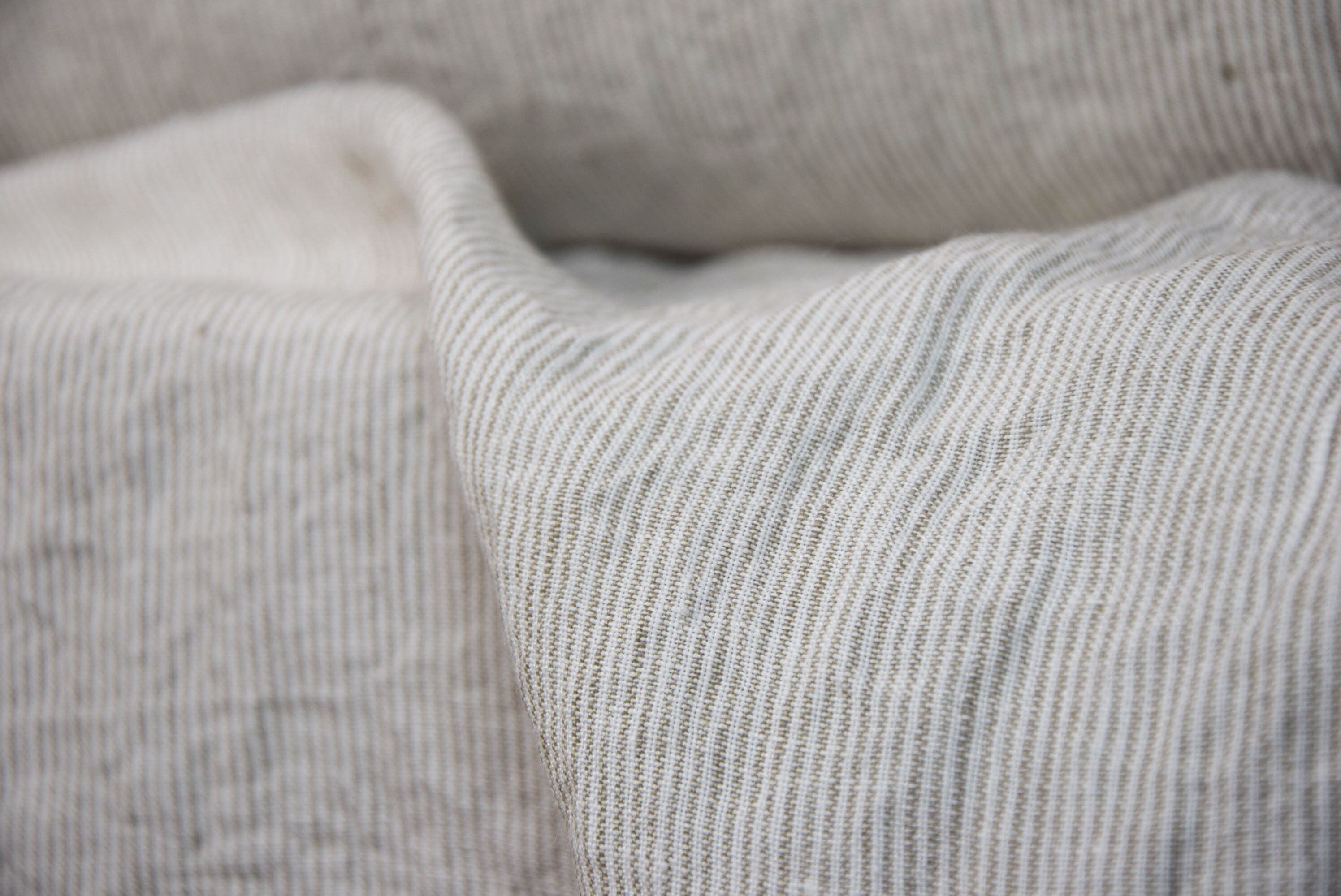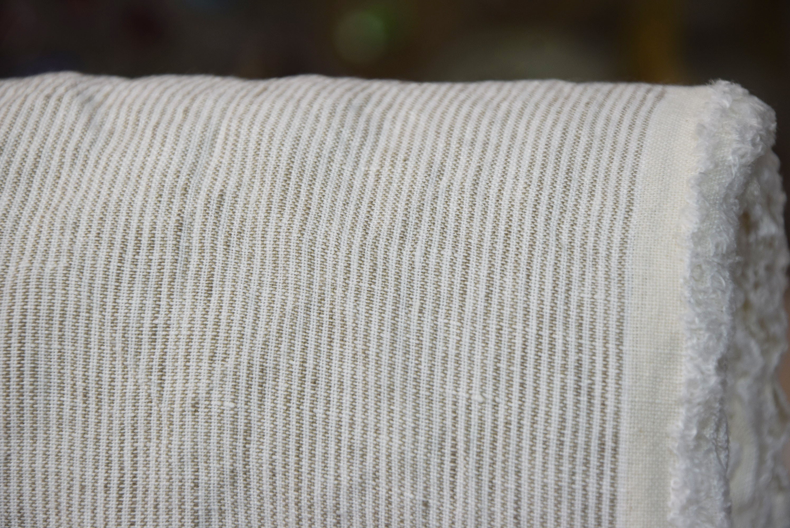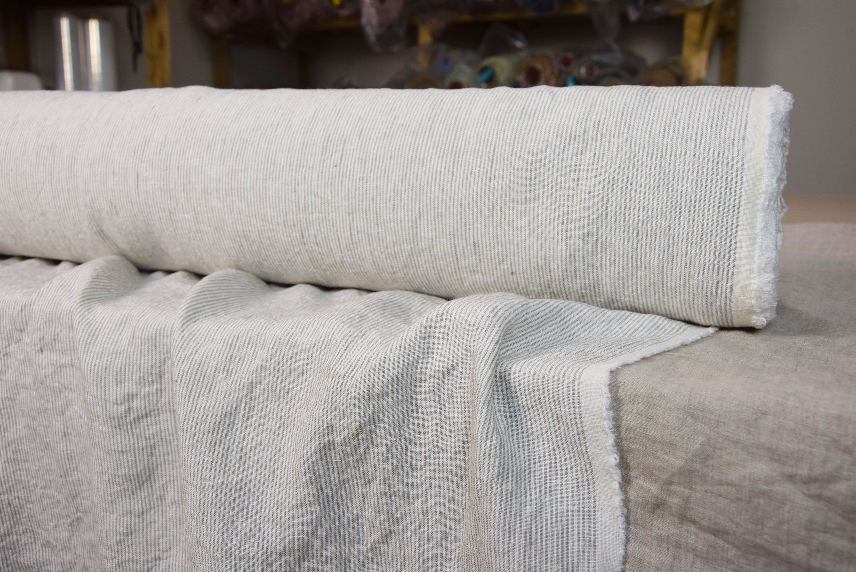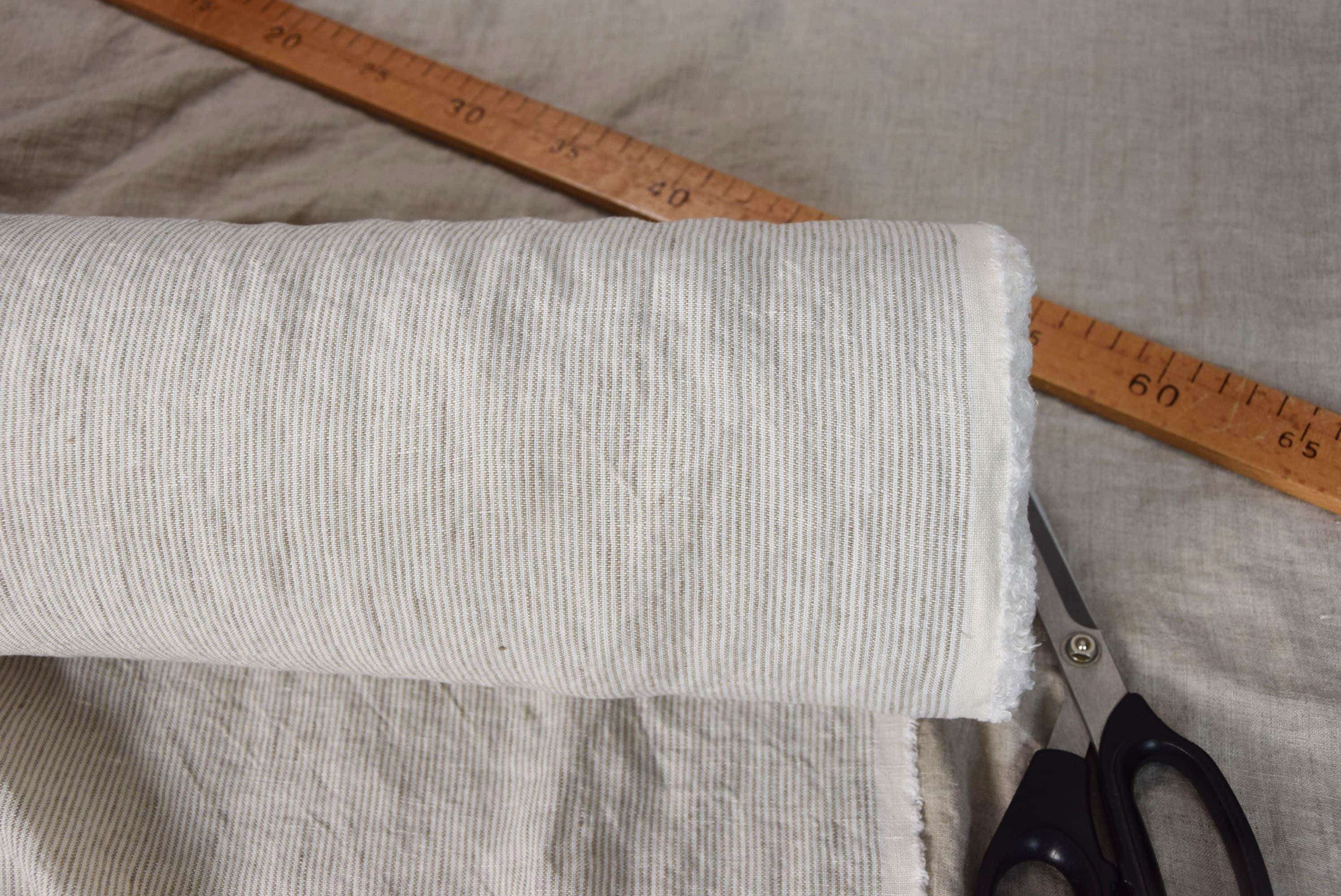 Pure linen fabric Elba Beige Pencil Stripes, middle weight dense, not sheer, soft, drape is good. Most popular for clothies. Suitable other textile too (bedding, cloth napkins, curtains, tablecloths, scarfs and many other textile). Off-white and beige narrow stripes (looks like drawn with a pencil). Width of the stripe is 1.5mm (one off-white + one beige is 3mm). The price 21.18EUR/m