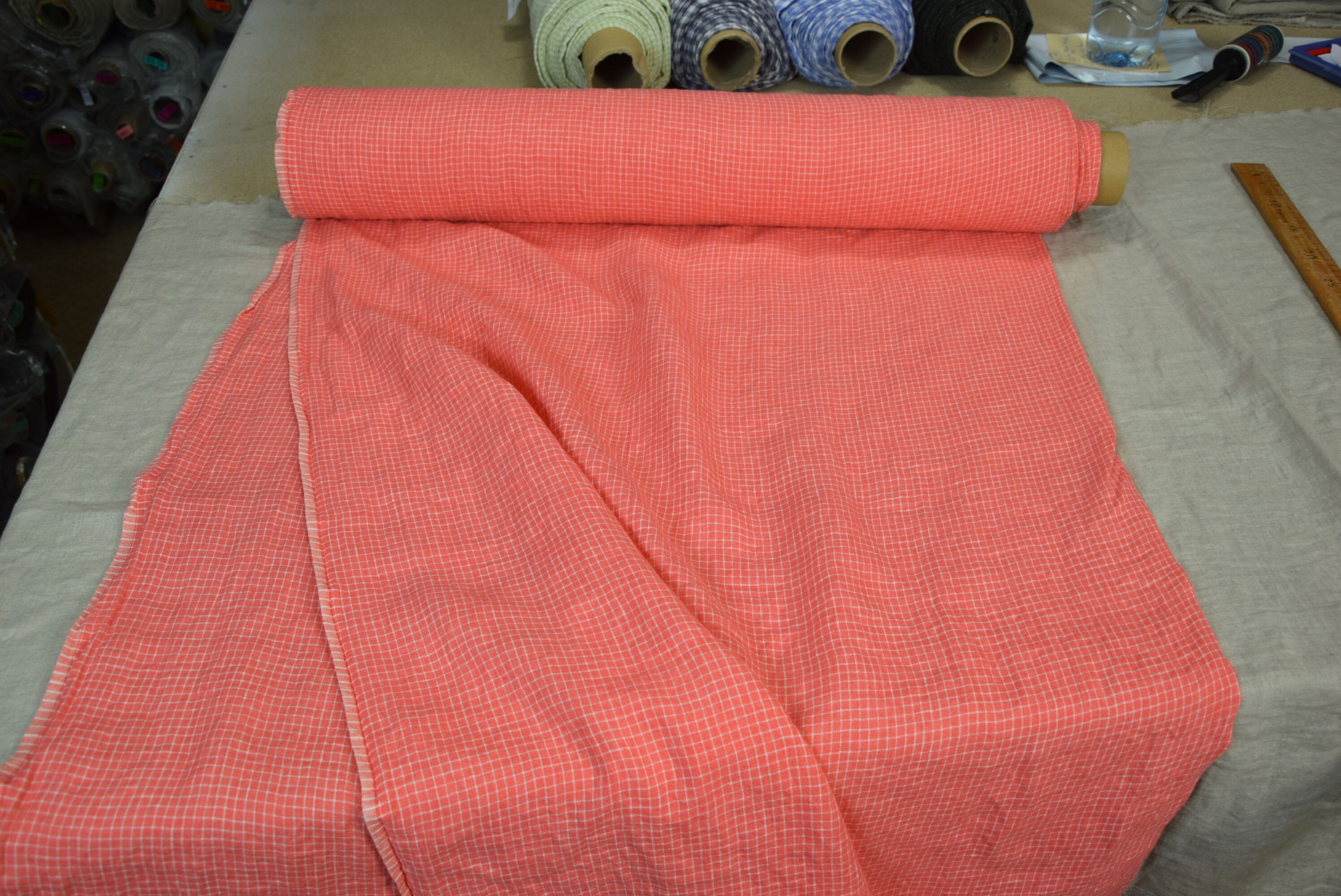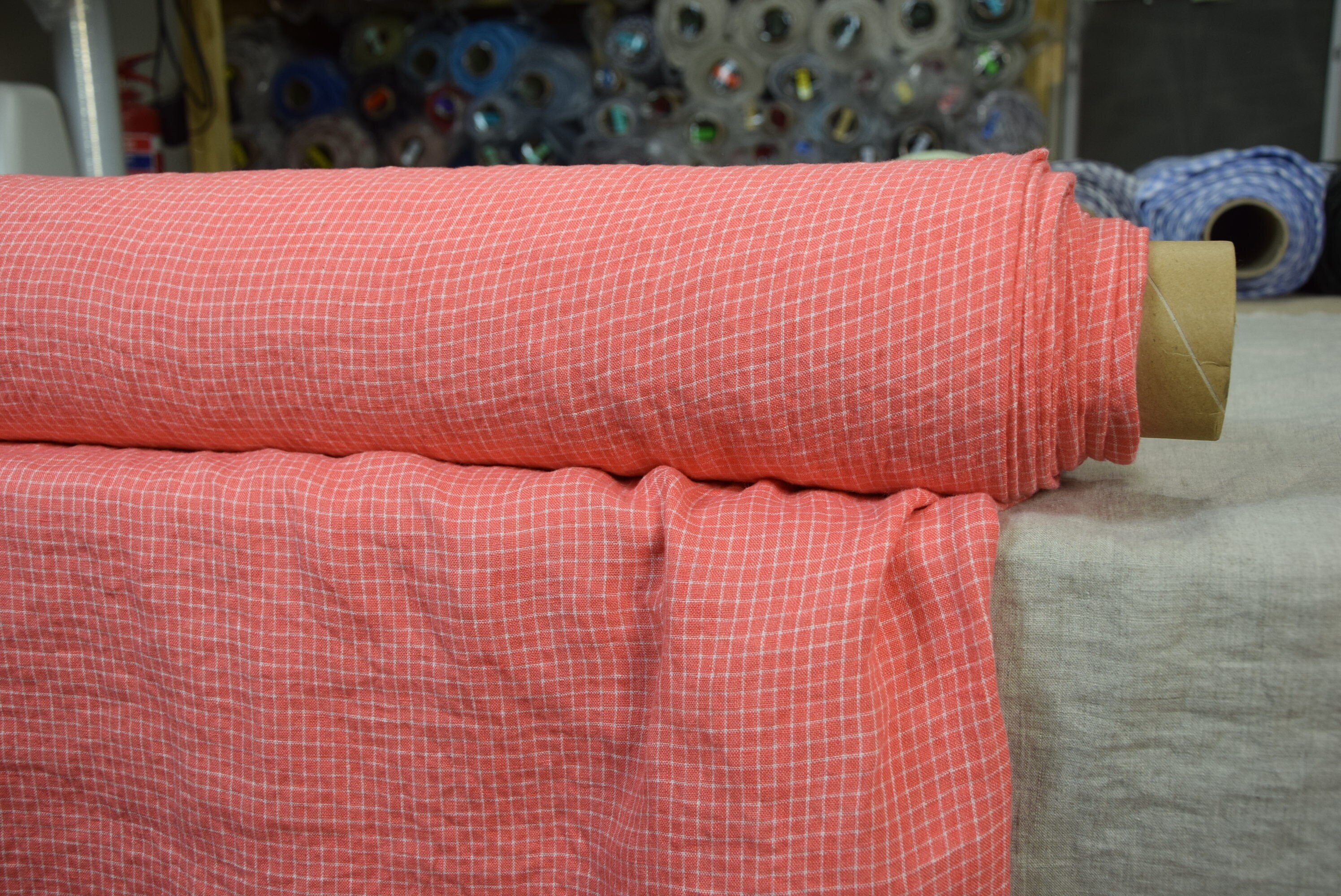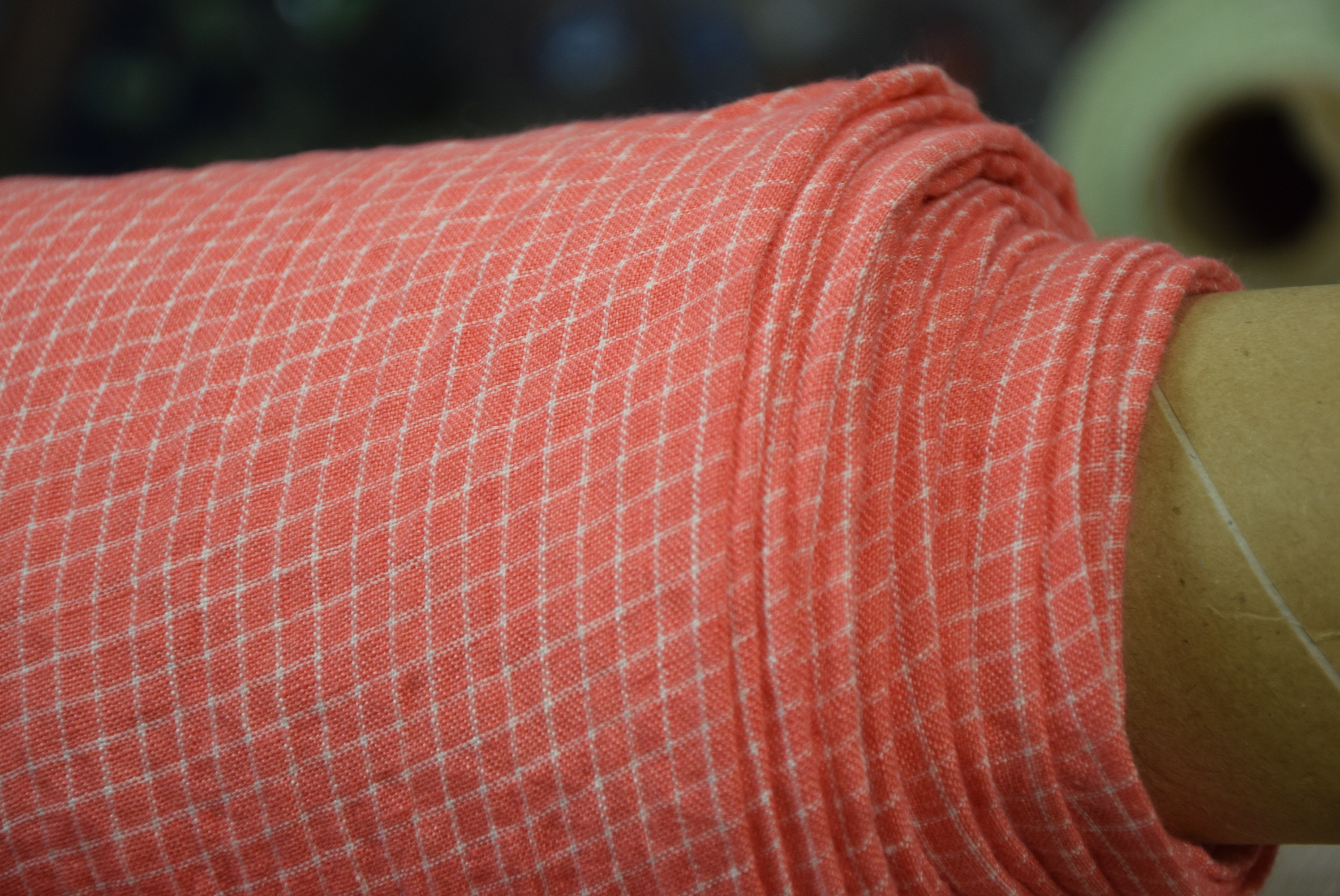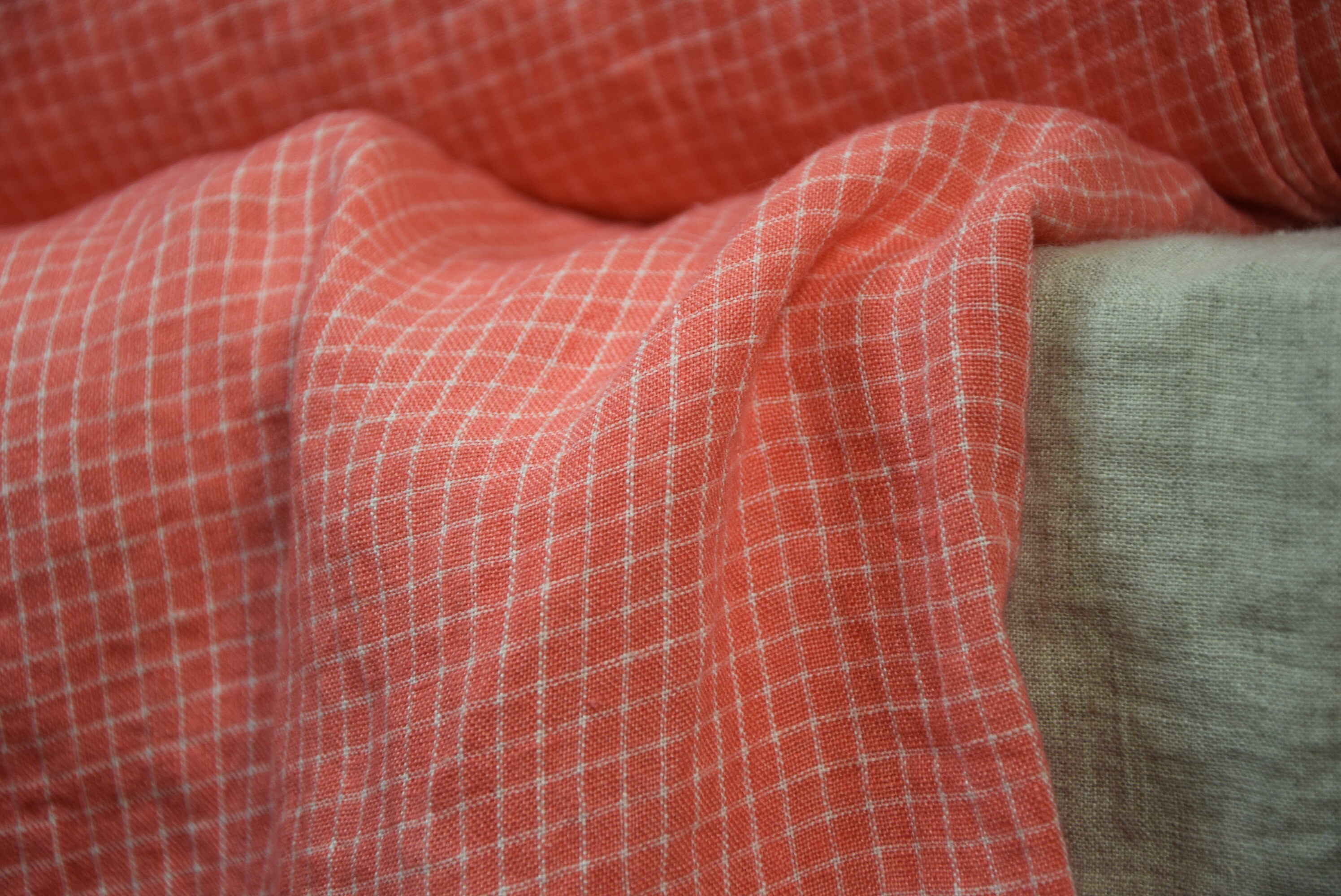 Pure linen fabric Regina Flamingo Pink Graph Check. Light weight, thin. Color is pink with red-orange tint. Dense,opaque, soft. Drape characteristic are very good. Popular for for light clothes - blouses, shirts, light dresses, scarfs, children clothes. Suitable for cloth napkins, curtains, and many other textile.
